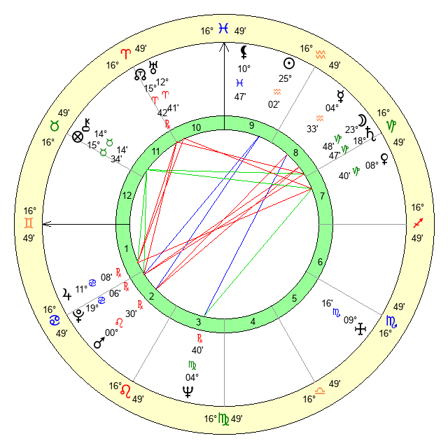 | Moon | 23 Capricorn 41 | 20 Virgo 25 | 22 Gemini 41 |