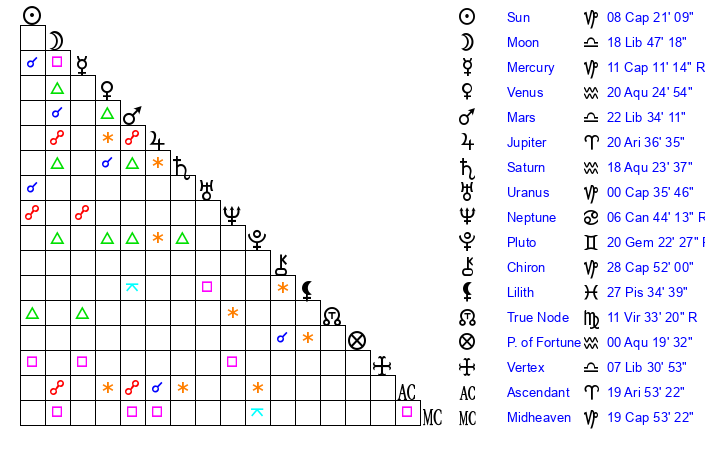 | Mars | 22 Libra 34 | 11 Capricorn 30 | 20 Scorpio 22 |