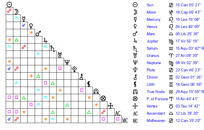 | Pluto | 22 Cancer 46 | 2 Aquarius 59 | 24 Cancer 41 |