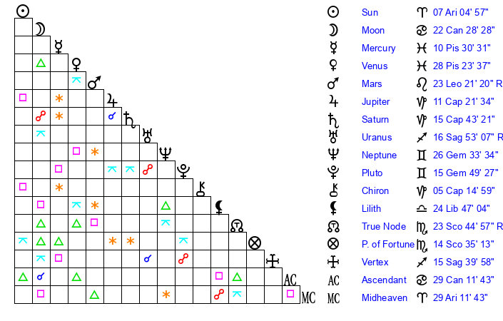 | Pluto | 15 Gemini 49 | 3 Aquarius 29 | 18 Gemini 16 |