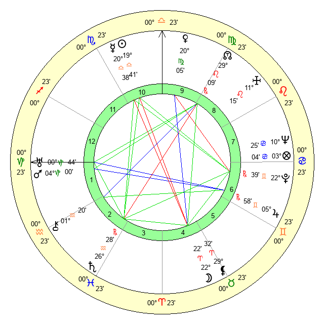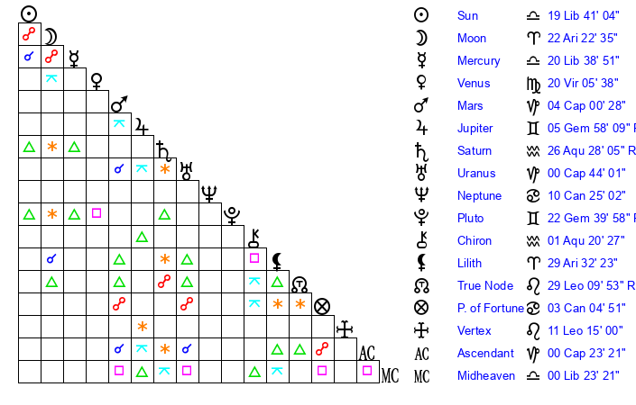 | Moon | 22 Aries 23 | 19 Cancer 52 | 8 Virgo 45 |
