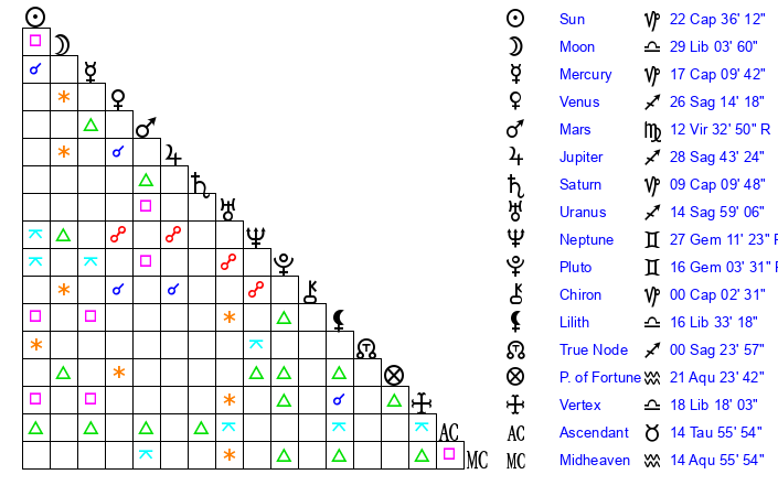 | Moon | 29 Libra 2 | 17 Cancer 32 | 14 Taurus 56 |
