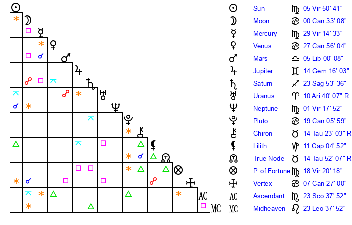 | Venus | 27 Cancer 56 | 4 Leo 48 | 25 Scorpio 30 |