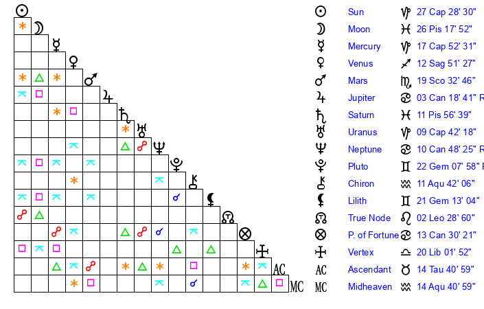 | Moon | 26 Pisces 19 | 24 Virgo 40 | 12 Cancer 19 |