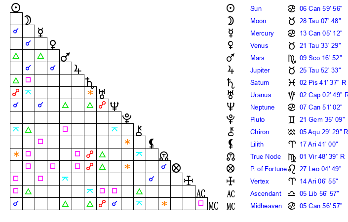| Jupiter | 25 Taurus 38 | 4 Cancer 28 | 4 Gemini 32 |