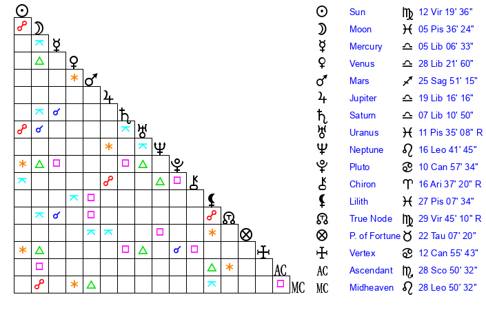 | Saturn | 7 Libra 47 | 29 Pisces 34 | 19 Libra 7 |
