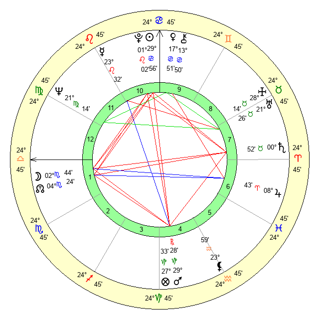 | Venus | 17 Cancer 52 | 21 Gemini 25 | 4 Scorpio 29 |