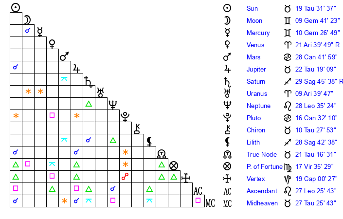 | Sun | 19 Taurus 32 | 20 Taurus 17 | 21 Leo 23 |
