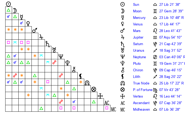 | Venus | 17 Libra 44 | 9 Libra 43 | 22 Pisces 2 |