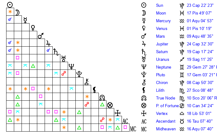 | Saturn | 19 Capricorn 45 | 15 Pisces 35 | 28 Capricorn 14 |
