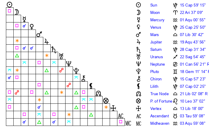 | Moon | 22 Aries 43 | 23 Aries 28 | 22 Libra 37 |