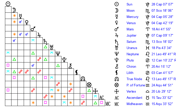 | Saturn | 13 Scorpio 50 | 15 Pisces 59 | 11 Scorpio 51 |
