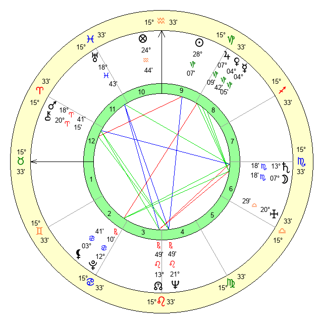 | Moon | 7 Scorpio 20 | 24 Virgo 40 | 11 Cancer 27 |