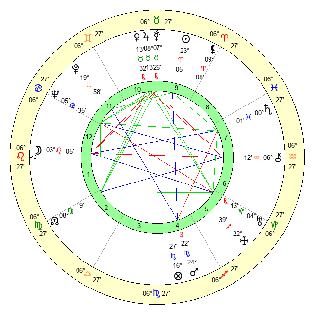 | Moon | 3 Leo 8 | 1 Scorpio 27 | 6 Capricorn 48 |