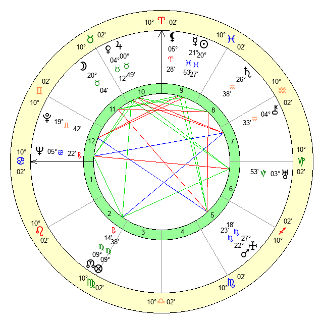 | Neptune | 5 Cancer 23 | 29 Pisces 17 | 8 Cancer 15 |