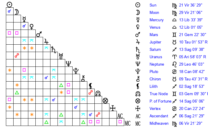 | Neptune | 29 Leo 47 | 0 Aries 59 | 1 Virgo 19 |