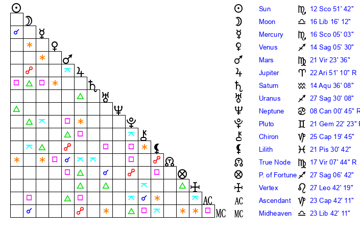 | Moon | 16 Libra 22 | 15 Taurus 38 | 20 Pisces 39 |