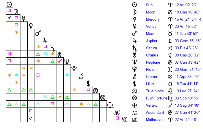 | Sun | 12 Aries 3 | 13 Aries 12 | 6 Leo 35 |