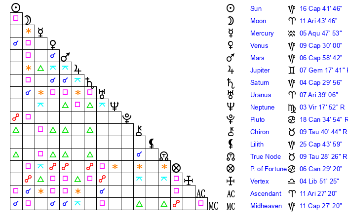 | Moon | 11 Aries 45 | 27 Aries 1 | 15 Libra 8 |