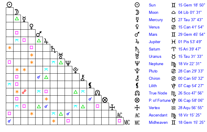 | Sun | 15 Gemini 18 | 16 Gemini 14 | 8 Virgo 35 |