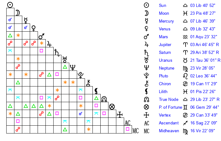 | Moon | 23 Pisces 54 | 9 Sagittarius 37 | 12 Taurus 50 |