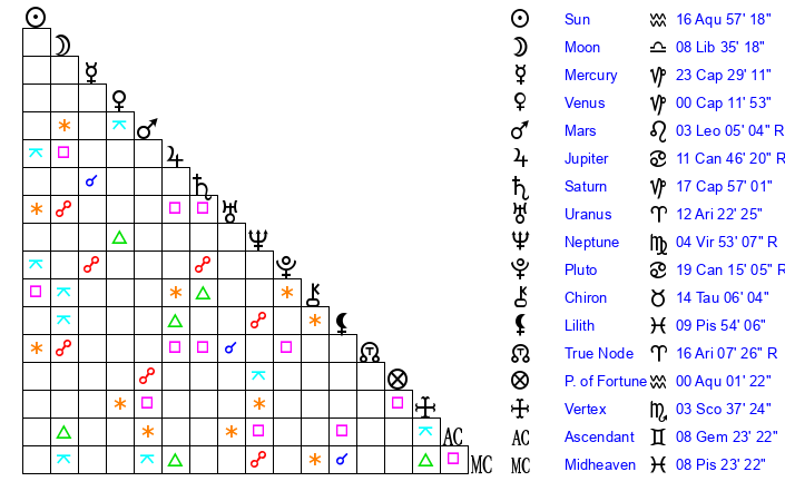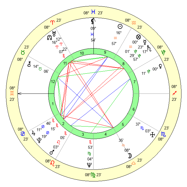 | Moon | 8 Libra 23 | 6 Gemini 0 | 13 Pisces 44 |