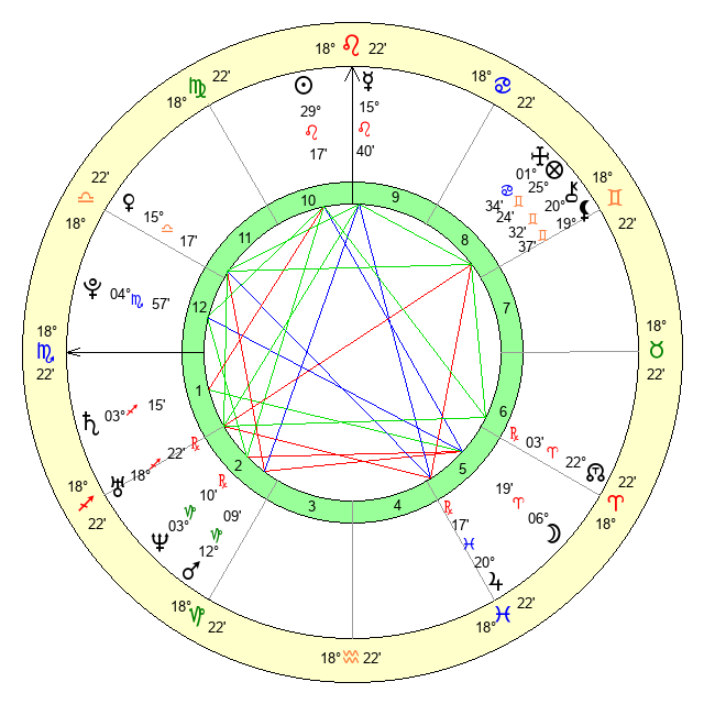 | Moon | 6 Aries 19 | 23 Leo 4 | 28 Leo 55 |