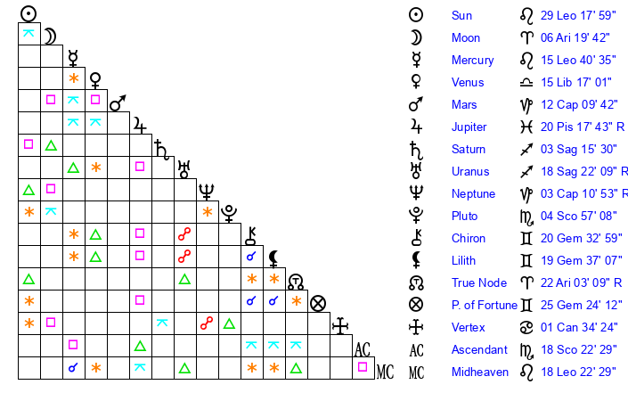 | Moon | 6 Aries 19 | 23 Leo 4 | 28 Leo 55 |
