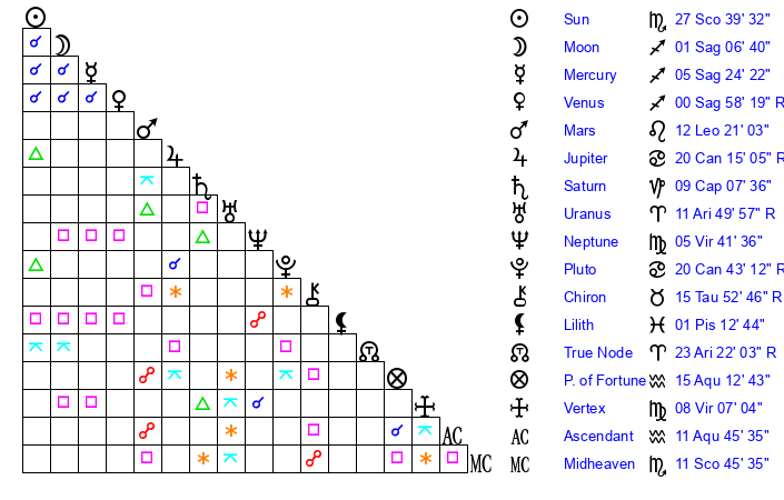 | Sun | 27 Scorpio 39 | 28 Scorpio 37 | 4 Pisces 7 |