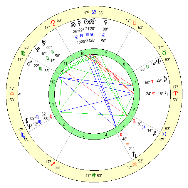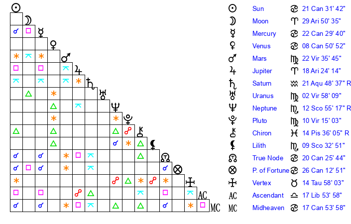 | Sun | 21 Cancer 32 | 22 Cancer 30 | 21 Virgo 9 |