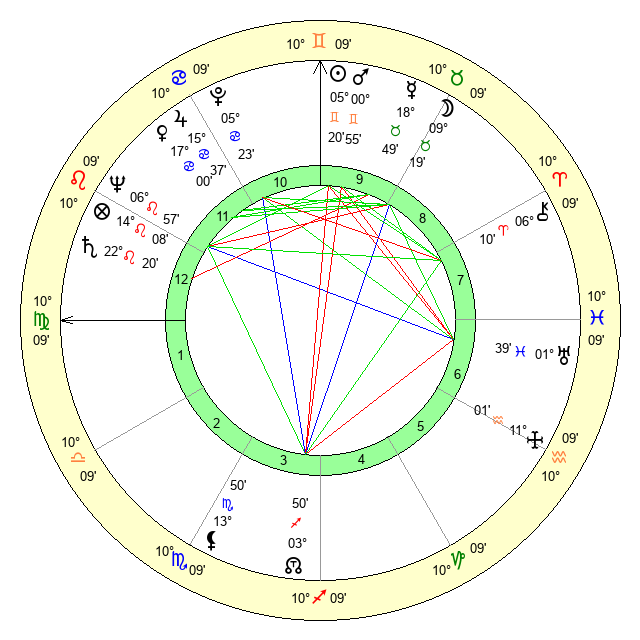 | Sun | 5 Gemini 20 | 6 Gemini 39 | 16 Virgo 55 |