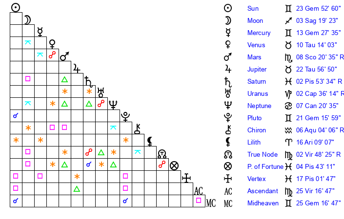 | Pluto | 21 Gemini 17 | 3 Aquarius 25 | 22 Gemini 40 |