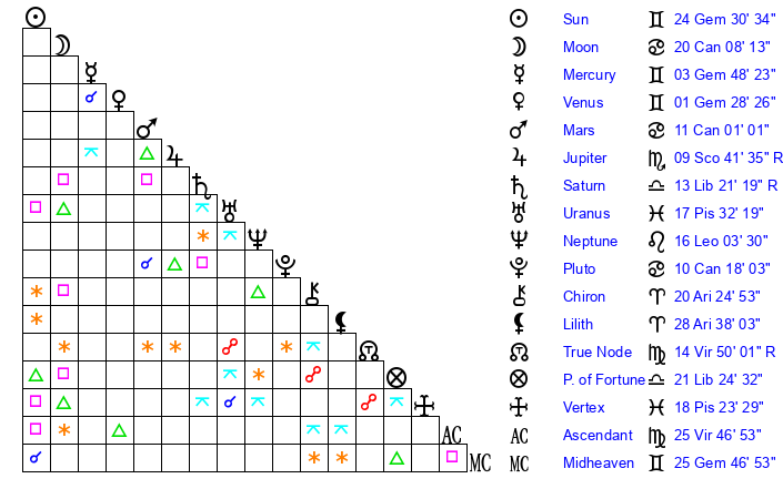 | Sun | 24 Gemini 30 | 25 Gemini 48 | 2 Libra 34 |