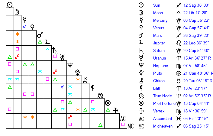 | Sun | 12 Sagittarius 36 | 13 Sagittarius 49 | 17 Pisces 55 |