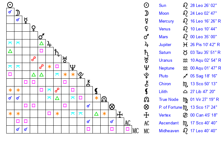 | Moon | 23 Leo 53 | 9 Leo 47 | 20 Leo 36 |