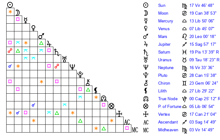 | Sun | 17 Virgo 47 | 18 Virgo 14 | 16 Sagittarius 27 |