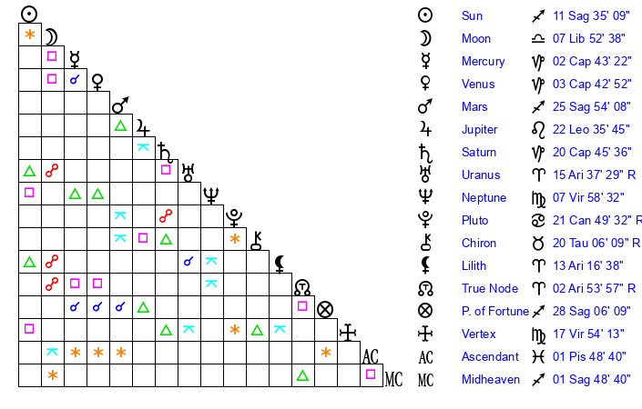 | Sun | 11 Sagittarius 35 | 12 Sagittarius 48 | 16 Pisces 55 |