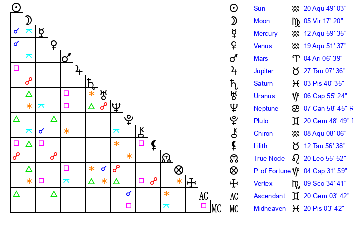 | Pluto | 20 Gemini 49 | 2 Aquarius 21 | 22 Gemini 7 |
