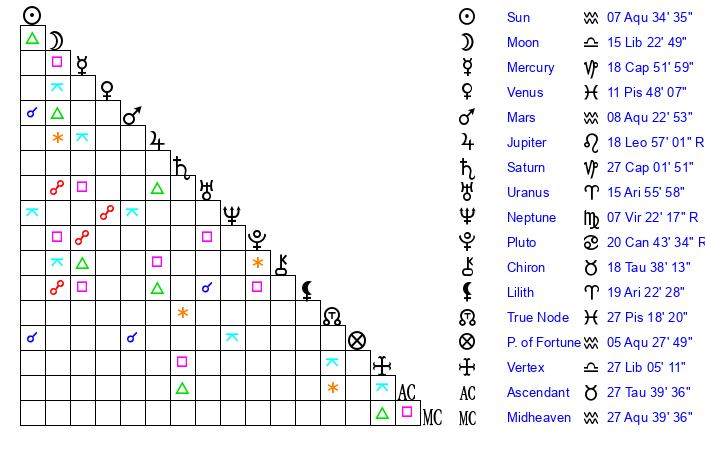 | Saturn | 27 Capricorn 14 | 17 Pisces 0 | 4 Aquarius 48 |
