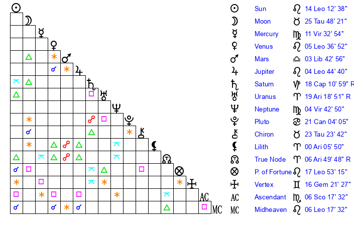 | Moon | 25 Taurus 38 | 25 Capricorn 29 | 12 Scorpio 56 |
