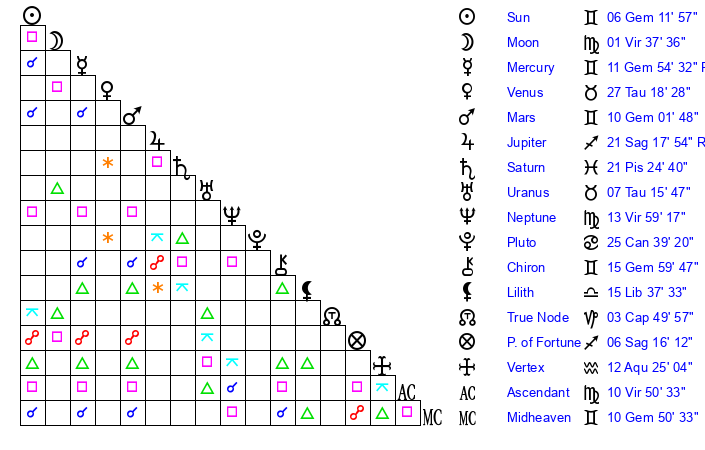| Sun | 6 Gemini 11 | 6 Gemini 39 | 1 Virgo 19 |