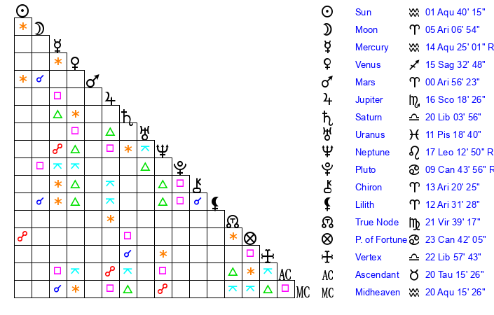 | Moon | 5 Aries 5 | 12 Scorpio 2 | 5 Capricorn 45 |