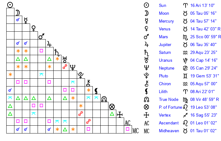 | Sun | 16 Aries 13 | 17 Aries 8 | 11 Leo 36 |