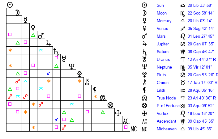 | Moon | 22 Scorpio 58 | 24 Scorpio 27 | 2 Taurus 24 |