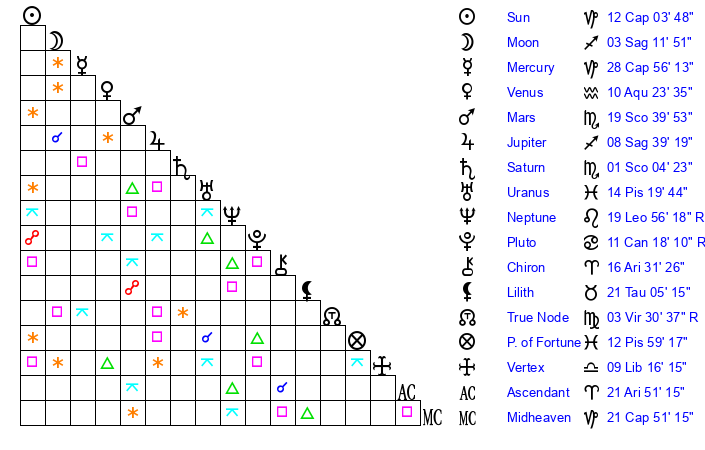 | Sun | 12 Capricorn 4 | 13 Capricorn 34 | 23 Aries 29 |
