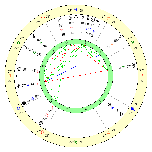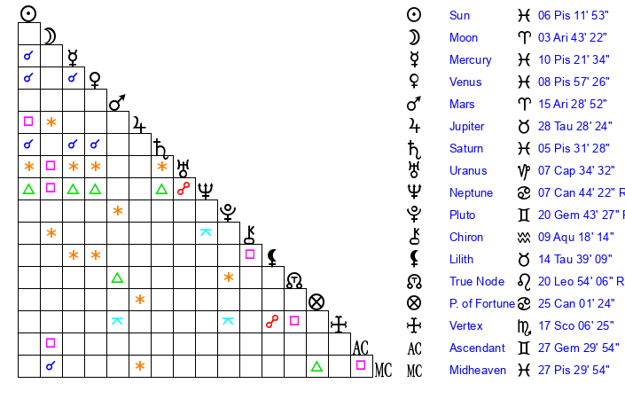 | Sun | 6 Pisces 12 | 7 Pisces 20 | 2 Cancer 14 |