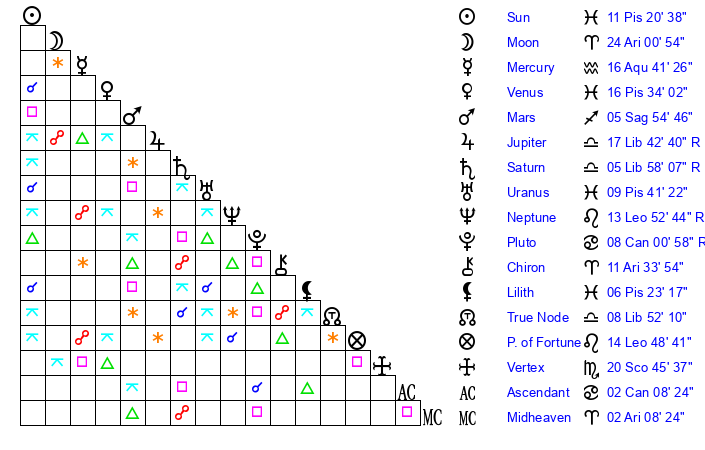 | Moon | 24 Aries 2 | 19 Aries 6 | 10 Aquarius 7 |