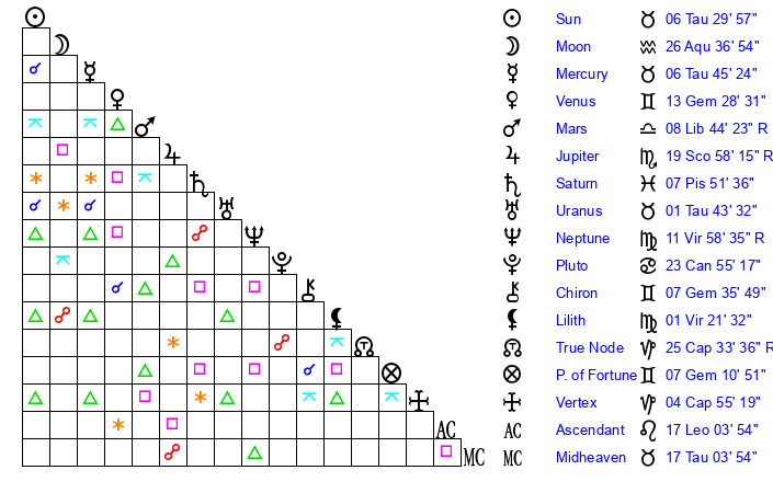 | Moon | 26 Aquarius 41 | 6 Taurus 15 | 20 Gemini 32 |
