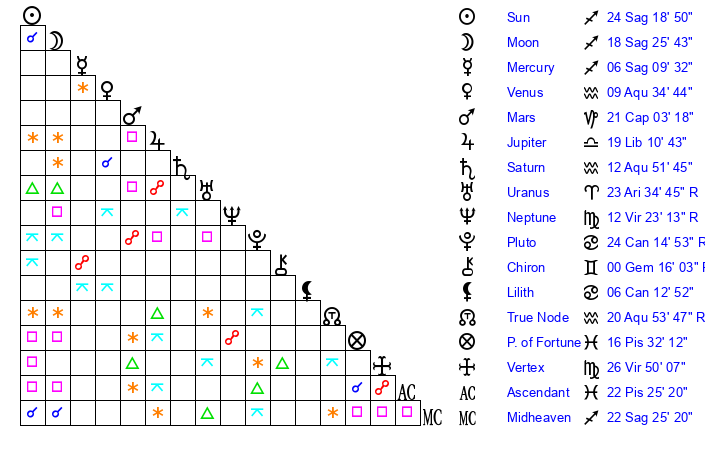 | Sun | 24 Sagittarius 18 | 24 Sagittarius 59 | 27 Pisces 24 |