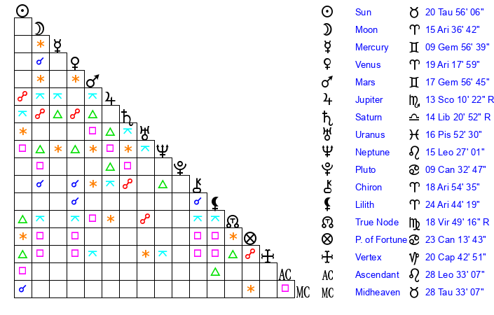 | Venus | 19 Aries 18 | 8 Aries 2 | 23 Leo 27 |